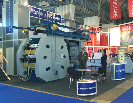 Kyivpolygraphmash JSC created a new model of flexographic machine for multi-color printing on various roll materials: polymer film, paper, foil, glassine, sausage casings and self-adhesive materials. The new eight-color machine has a compact planetary construction with a central printing cylinder, and its colorful devices are equipped with closed doctor blades. It has an optimal level of automation with a three-loop web tension system and separate control of the onslaught of anilox and plate shafts. The machine is equipped with modern systems of lateral alignment and video control. Programmable controllers and frequency drives of the machine are used by MITSUBISHI and ABB.